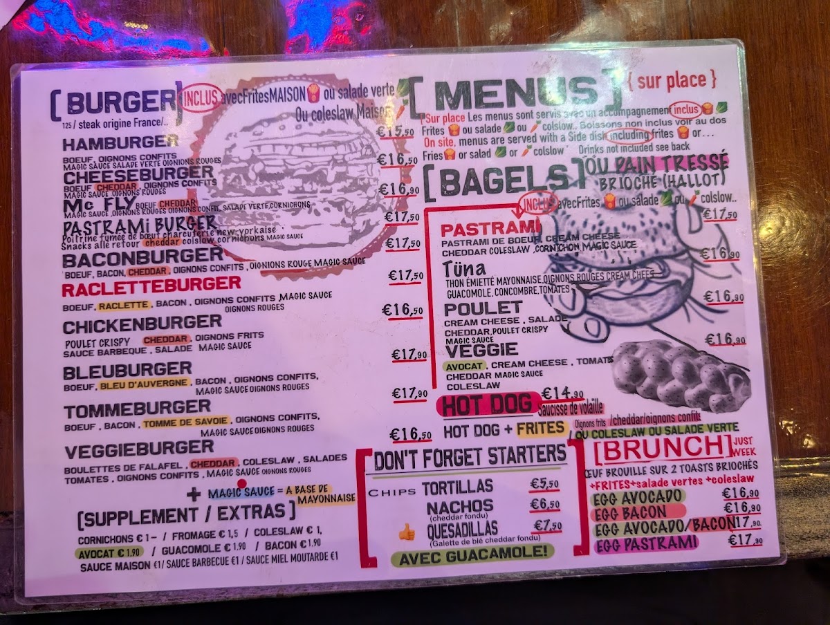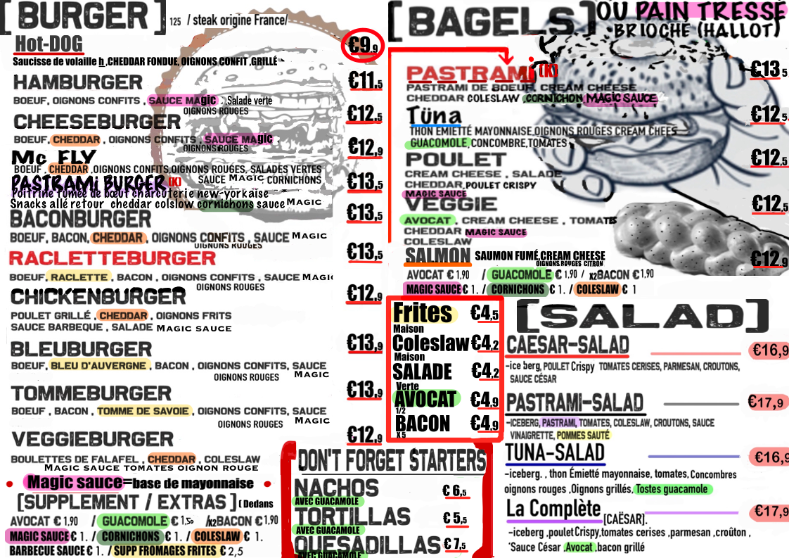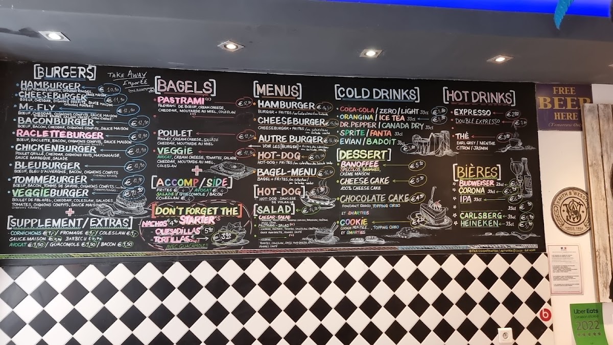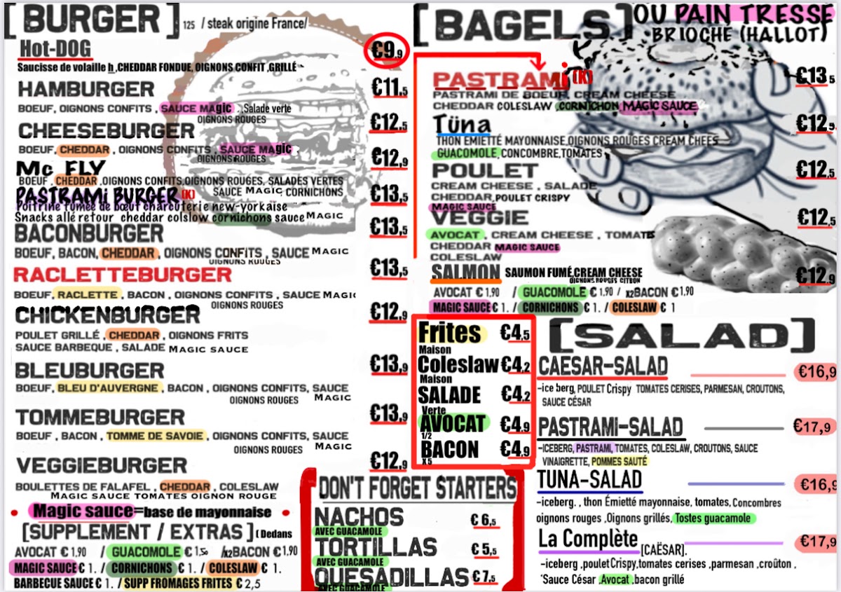 Food items are grouped into categories including burgers, bagels, hot dogs, salads, and desserts. Burger options range from variations like the Blue Burger, Bacon Burger with Egg Benedict, Raclette Burger, and Burger Paris, alongside other burger choices with different accompaniments. Bagels are served with sides such as fries and sparkling water. Desserts like cheesecake are also available.