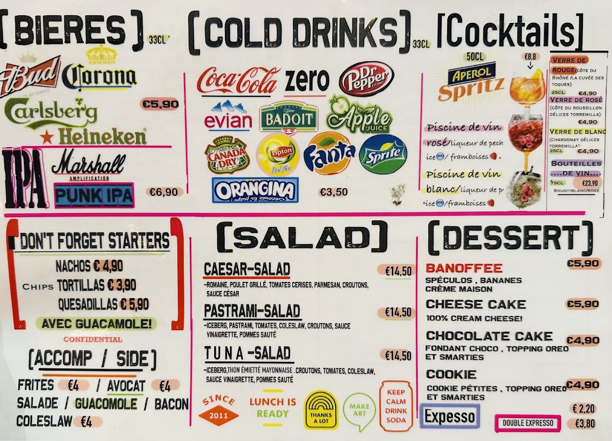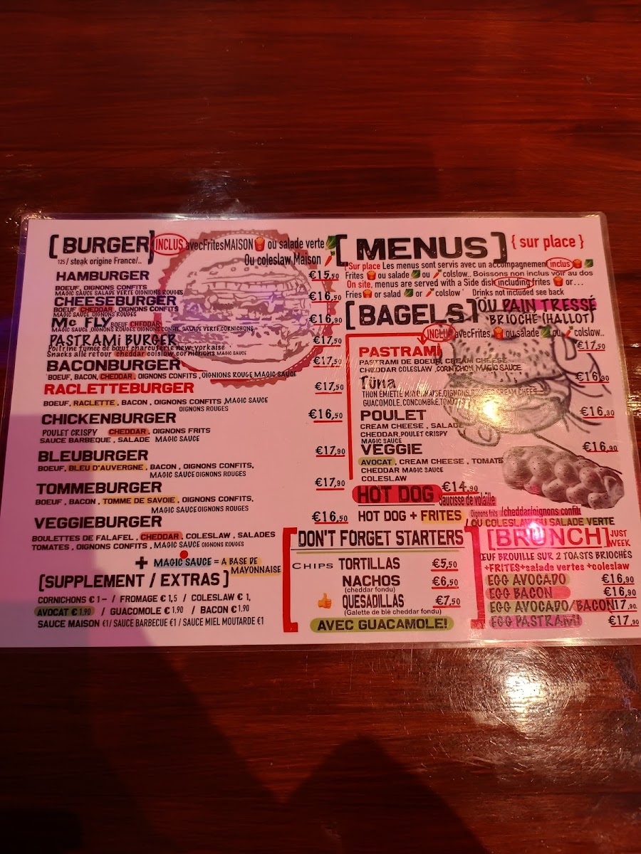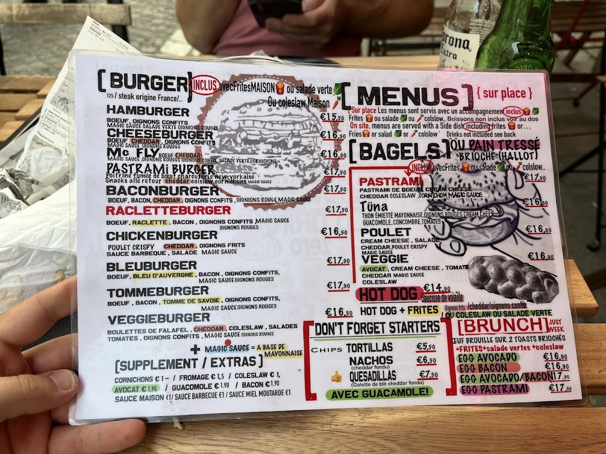 Food items are grouped into categories including burgers, bagels, hot dogs, salads, and desserts. Burger options range from variations like the Blue Burger, Bacon Burger with Egg Benedict, Raclette Burger, and Burger Paris, alongside other burger choices with different accompaniments. Bagels are served with sides such as fries and sparkling water. Desserts like cheesecake are also available.